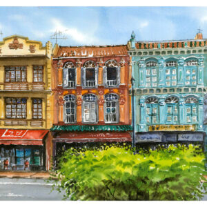 This artwork captures the vibrant charm of Upper Cross Street in Chinatown, Singapore, where beautifully preserved shophouses stand as a reminder of the city’s rich cultural heritage. Painted in watercolours, the piece highlights the ornate facades, pastel tones, and timeless details that make these buildings such iconic landmarks. While predominantly shaped by Chinese immigrants, the area was also home to other communities. Shophouses here doubled as homes, businesses, and clan associations.
