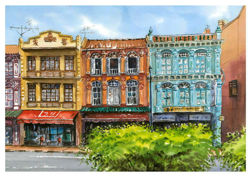 This watercolour painting of the iconic and historical Joo Chiat shophouses was done on a commissioned basis. The painting captures the intricate peranakan details of the shophouses. I have taken artistic liberties to enhance the artwork by adding plants, trees and Chinese New Year decor.