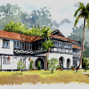 This beautiful watercolour artwork captures the hotel’s elegant façade and showcases the hotel’s intricate architectural details, from its classic columns to the charming surrounding landscape. Through this painting I have attempted to bring the scene to life, evoking a sense of tranquility and sophistication that reflects the hotel’s ambiance.