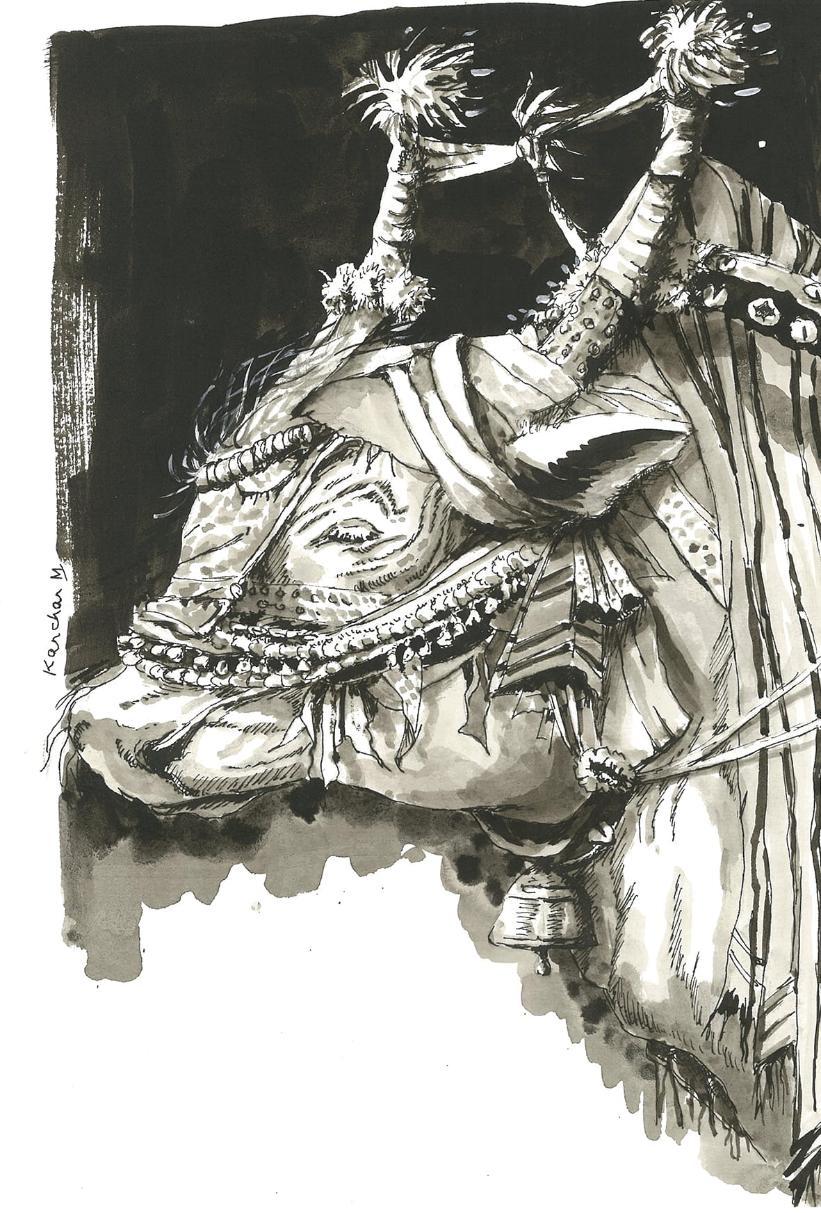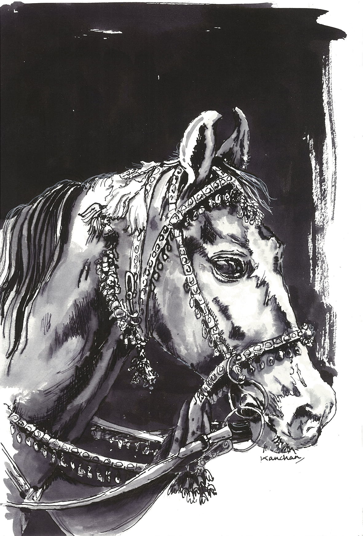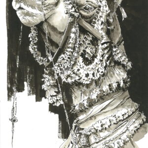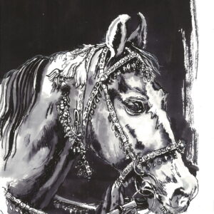 The decorated Indian horse is rendered without colour, allowing line, texture, and contrast to take centre stage. Every detail,from the ornate adornments to the gentle curve of the form, relies on tonal balance and intentional mark-making. Stripped of colour, the horse’s presence becomes more powerful, inviting the viewer to slow down and notice the rhythm of lines and the interplay of light and shadow.