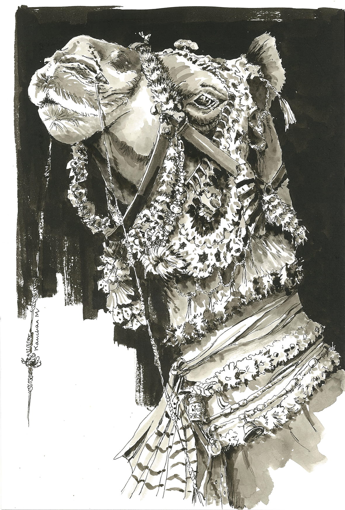 The third painting in this four-part black and white ink series features the Indian camel – a symbol of endurance, adaptability, and steadfast grace.