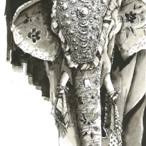 The second painting in this four-part black and white ink series features the Indian elephant – a symbol of wisdom, strength, and quiet resilience.