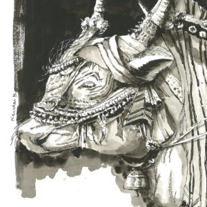 The fourth and final painting in this black and white ink series features the Indian cow – a symbol of gentleness, nourishment, and quiet abundance.